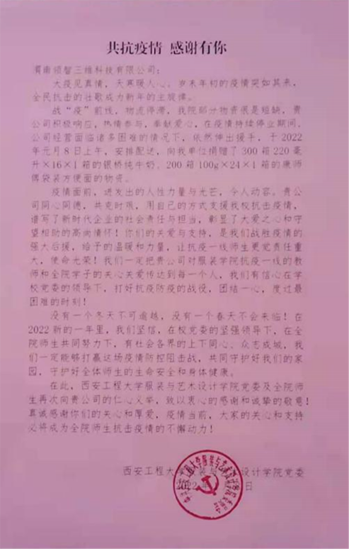 疫情無(wú)情人有情,渭南領(lǐng)智三維科技有限公司積極行動(dòng),與西安工程大學(xué)服裝與藝術(shù)設(shè)計(jì)學(xué)院劉凱旋、應(yīng)博安教授和學(xué)院學(xué)生辦蔡洋老師取得聯(lián)系后,多個(gè)渠道緊急聯(lián)系籌備物資,于1月8日下午向西安工程大學(xué)捐贈(zèng)了300箱銀橋純牛奶、200箱康師傅方便面,物資送到西安工程大學(xué)服裝與藝術(shù)設(shè)計(jì)學(xué)院。