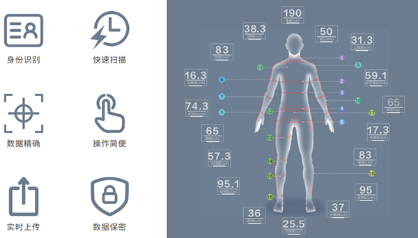 領智三維BodyScan系列三維人體掃描系統(tǒng),采用自主知識產(chǎn)權(quán)的3D紅外傳感測量技術(shù),通過多組3D深度攝像頭的同步控制,可高效、準確地采取人體三維數(shù)據(jù),完成幾十項人體關(guān)鍵尺寸提取并集成了人體身體成分的相關(guān)算法,在人體測量的同時可同步輸出人體相關(guān)的體型體態(tài)信息。