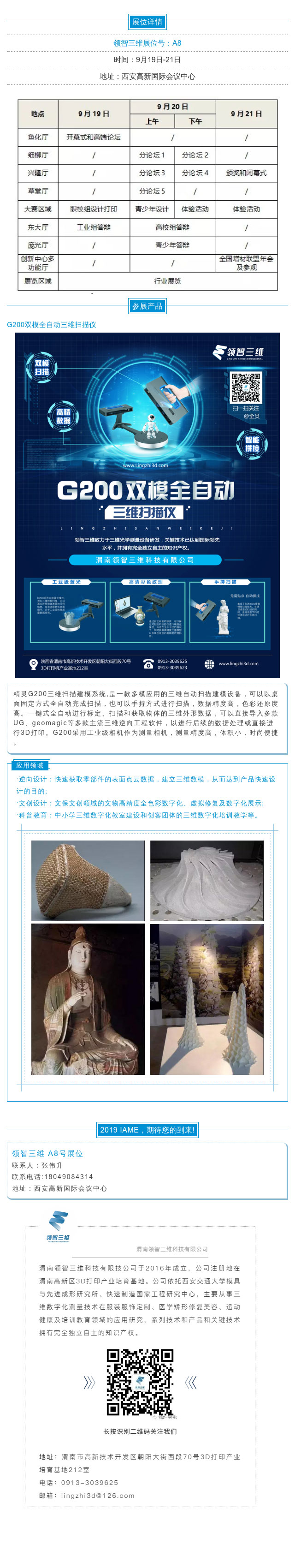 2019中國(西安)國際3D打印博覽會暨高峰論壇將于9月19-21日在西安高新國際會議中心舉行,此次展會將邀請50余家國內外增材制造領域科研機構和相關企業(yè)參與展覽展示,領智三維作為技術領先企業(yè)受邀參加此次展會,并將隆重推出新一代多功能產品G200雙模全自動三維掃描儀。屆時,歡迎各界人士蒞臨參觀指導!